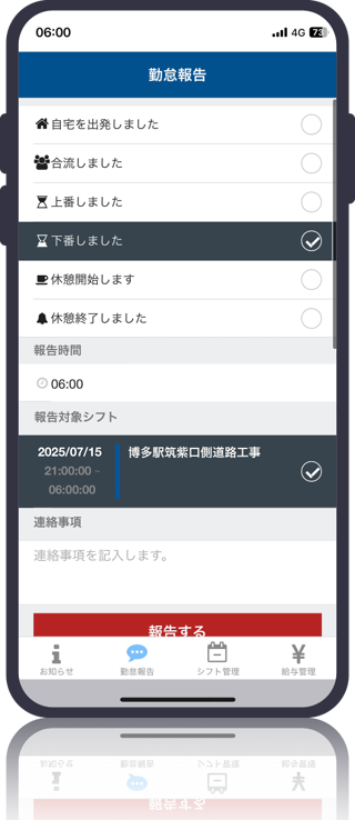 最初は“こんなもんいらん”と思ってましたよ。紙のほうが早いし、いちいちスマホなんて面倒くさいって。でもいざ使ってみたら、打刻も日報も押すだけでした。けど、もう少し文字が大きいともっと見やすいかな!」